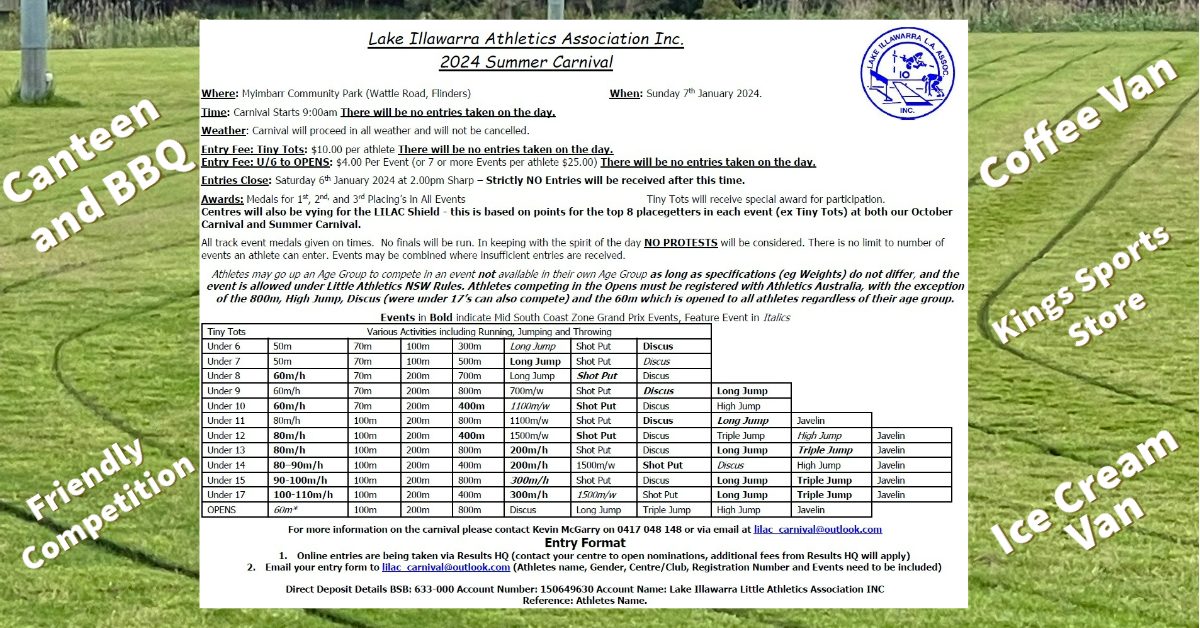 January 7, 2024 @ 9:00 am - 5:00 pm Lake Illawarra Summer Carnival 2024 Myimbarr Community Park Wattle Rd, Shellharbour The popular Summer Carnival is back for another year, this year it will be conducted on the 7th January 2024....